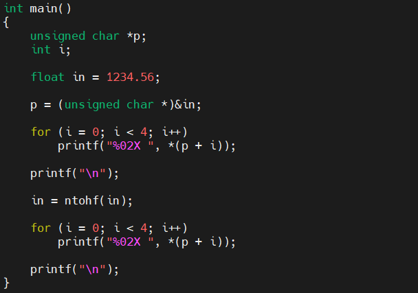 #include <stdio.h> #include <arpa/inet.h> #define UNION_TYPE #ifdef UNION_TYPE typedef union { float f; uint32_t u; } conv_byte_f; float ntohf(float f) { conv_byte_f conv; conv.f = f; conv.u = ntohl(conv.u); return conv.f; } #else float ntohf(float f) { uint32_t *p; p = (uint32_t *)&f; *p = ntohl(*p); return f; } #endif int main() { unsigned char *p; int i; float in = 1234.56; p = (unsigned char *)∈ for (i = 0; i < 4; i++) printf("%02X ", *(p + i)); printf("\n"); in = ntohf(in); for (i = 0; i < 4; i++) printf("%02X ", *(p + i)); printf("\n"); } |